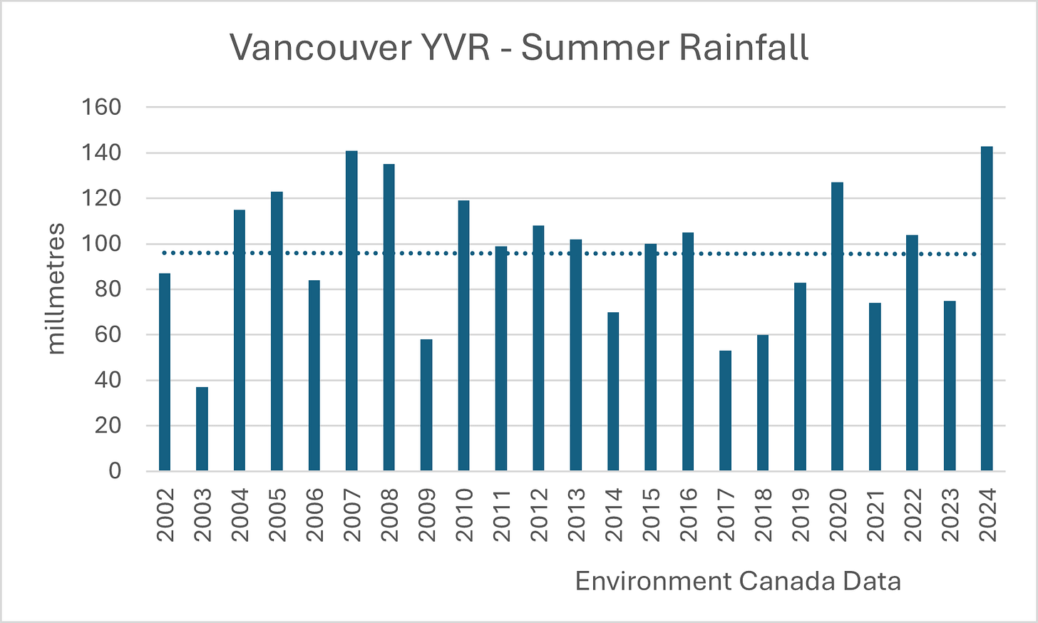 Environment Canada’s Vancouver Harbour weather station on Burrard Inlet has precipitation records going back 100 years to 1925. During that time there have been 42 intense rainstorms that included at least 100 mm falling over a 5 day period.